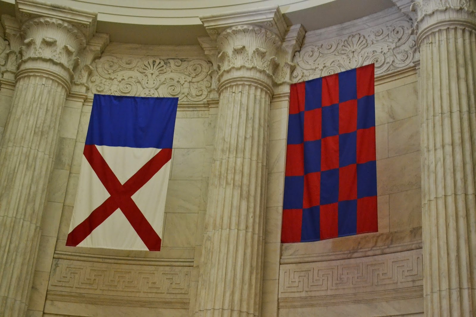 Marriott, it serves as a luxury hotel. What many people who see it don't know though is that the base of the building is still very much open to the public. Go inside and get literature free of charge from the front desk, and then you can take a tour through the antebellum structure's breathtaking Greek revival interior, including the original dome, which resides underneath the tower today. Hanging from the ceiling around the dome, you will find very strange flags, representing prominent merchant houses of the custom house's hayday: J.H. Shattuck & Co., Z. Azarian & Co., John Mayo & Co., Gilden & Williams, H. Oxnard, and Brocker & Stugis (see photos below).